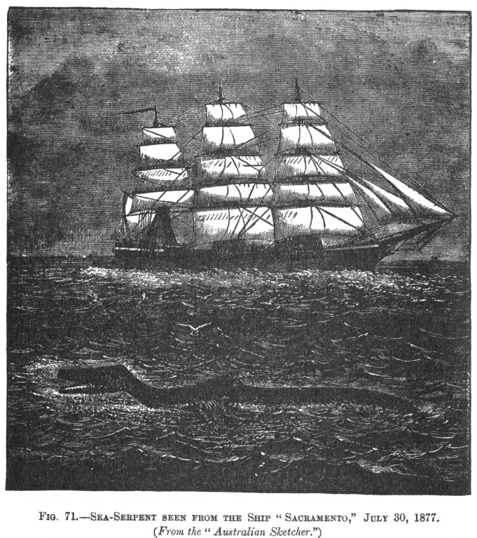 I have elsewhere stated my conviction that the serpent Midgard is only a corruption of accounts of the sea-serpent handed down from times when a supernatural existence was attributed to it; and we have in the Sagas probably the earliest references to it, unless, perhaps, the serpents mentioned by Aristotle, which attacked and overset the galleys off the Libyan coast, may have been of this species.
