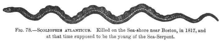 FIG. 78.SCOLIOPHIS ATLANTICUS. Killed on the Sea-shore near Boston, in 1817, and at that time supposed to be the young of the Sea-Serpent.