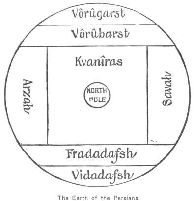 158:2 The diagram attempted by Windischmann, Zoroastrische Studien, p. 67, is inconsistent with the Bundahish, ch. v., 9. So must be every attempt to arrange the keshvares on a flat earth.