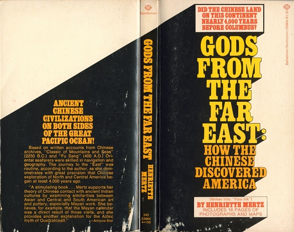 Mertz self-published this in 1953, and followed it up with a second edition in 1972, which corrected many of the endemic typos in the first edition. The book was reissued in paperback by Ballentine in 1975 as Gods from the Far East: How The Chinese Discovered America (see cover), apparently in an effort to cash in on the Van Daniken craze. However, Pale Ink is a much better effort than Van Daniken, as Mertz is not obsessed with explaining every Native American technological advance as a borrowing from unknown visitors.