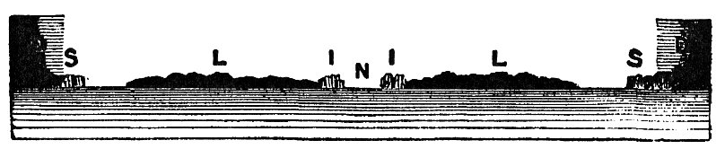The earth's surface is represented by the diagram, fig. 54, and a sectional view in fig. 55. N, the central open sea, I, I, the circular wall or barrier of ice, L, L, L, the masses of land tending southwards, W, W, W, the "waters of the great deep," surrounding the land, S, S, S, the southern boundary of ice, and D, D, D, the outer gloom and darkness, in which the material world is lost to human perception.