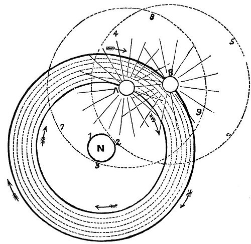 path, N represents the polar centre, A the sun in its path in June; which daily expands like the coils of the mainspring of a watch, until it reaches the outer and larger path B, in December, after which the path gradually and day by day con-tracts until it again becomes the path A, on the 21st of June.