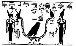 2. A large two-headed serpent called THES-HRAU, which is depicted in the form of a pair of horns deeply curved towards the ends where they meet. The head which faces to the right has on it a White Crown, and is directly opposite to the face of a goddess, who also wears a White Crown, and is called