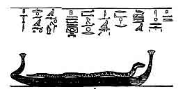 1. The boat of the sun, in which the god stands under a canopy formed by the serpent Mehen; he