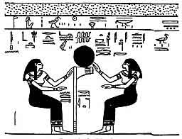 [paragraph continues] MENENUI. To the, right is a youthful goddess wearing a White Crown, and to the left is a similar goddess wearing a Red Crown each holds the index finger of one hand to her mouth, after the manner of children, and each is depicted in the act of sitting, but lacks a seat or throne.