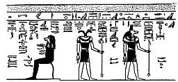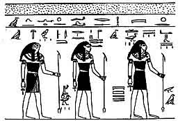 1. The god Horus, hawk-headed and wearing a disk, leaning on a staff.