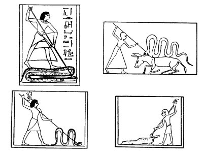 3 Compare the following scenes which represent Apep in the form of a serpent and crocodile and ass being pierced by the deceased.