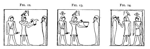 the deceased (Fig. 12) with the instrument ###[1], and the Kher-heb at the same time says: "O Sem priest, lay the pesh-en-kef upon his mouth, and say, 'I have stablished for thee thy two jaw-bones in thy face which was divided into two parts.'" The Sem priest next makes an offering of grapes (Fig. 13), the Kher-heb saying: "O Sem priest, place the grapes upon his mouth and say, 'He bringeth to thee the eye of Horus, he graspeth it; do thou also grasp it.'" After an ostrich feather has been offered (Fig. 14) by the Sem priest, and a number of the ceremonies described above have been repeated, and other animals slaughtered, the Kher-heb addresses the Sem priest, and says: "Take the instrument Tun-tet[2] (thrice) and open the mouth and the eyes" (four times). He then continues: "O Sem priest, take the iron instrument of Anubis, Tun-tet (thrice). Open the mouth and the two eyes (four times), and say, 'I open for thee thy mouth with the iron instrument of Anubis with which he opened the mouths of the gods. Horus openeth the mouth, Horus openeth the mouth,
