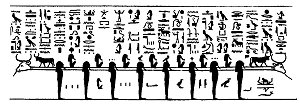 Before AFU-RA can pass into the THIRD DIVISION it is necessary for him to pass through a Gate which is protected by two strong walls, with a passage running between them. This passage is swept by flames of fire which proceed from two uraei; each end of it is guarded by a warder in mummied form, and on the inner side of the inner wall is a company of gods. The Gate is called SEPTET-UAUAU, and the name of its monster serpent is AQEBI. So soon as the Boat enters the DIVISION or HOUR four of the gods of the region appear, and take it in tow; the god is in the same form as before, and has in no way suffered by his passage through the Gate, because at the word of SA the Gate opened, the flames which swept between the walls ceased, and the warders of the passage and the guardian gods withdrew their opposition. In this DIVISION a serious obstacle had to be overcome. Immediately in the fair way of the course of AFU-RA is a group of eight gods, called FAIU-NETERU, who bear on their shoulders a long pole-like object, each end of which terminates in a bull's head. This object is,