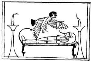 The soul of the scribe Ani visiting his mummified body as it lies on its bier in the tomb.
