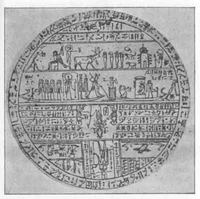 An examination of mummies of the late period shews that the Egyptians did actually draw a figure of the cow upon papyrus and lay it under the head of the deceased, and that the cow is only one figure among a number of others which were drawn on the same papyrus. With the figures magical texts were inscribed and in course of time, when the papyrus had been mounted upon linen, it superseded the gold figure of the cow which was fastened to the neck of the deceased, and became, strictly speaking an amulet, though its usual name among archaeologists is "hypocephalus." The figure on the opposite page well illustrates the object. It will be noticed that the