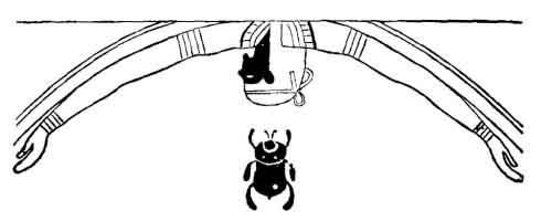 two arms of Horus, with the head hanging downwards, as the Almighty is painted by some of the early Italian masters (see Fig. 86). At the same time, either alone, or in his three characters of Horus the King, Horus the Scarabeus, and Horus-Ra, he sits in the sacred barge, which used to be filled with either Amun-Ra or Kneph-Ra. To Horus, with the head of a hawk, is then given the two sceptres of Osiris, and he is sometimes worshipped on the funereal papyri as the judge of the dead in place of his father. The sinner hopes to find more mercy at the judgment seat of the son. He then even rises over his father, and becomes the more important of the two in the minds of the worshippers. On a mummy case in the British Museum, where Horus is seated on the throne, holding the two sceptres of the judge, Osiris and Isis are standing before him as gods of lower rank, and as he is spoken of by the writer of Deuteronomy, who says, chap. xxxiii. 27, "The eternal God is thy refuge, and underneath are the everlasting arms."