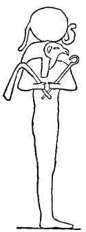 At times he forms one of a trinity in unity, with Ra and Osiris, as in Fig. 87, a god with the two sceptres of Osiris, the hawk's head of Horus, and the sun of Ra. This is the god described to Eusebius, who tells us that when the oracle was consulted about the divine nature, by those who wished to understand this complicated mythology, it had answered, "I am Apollo and Lord and Bacchus," or, to use the Egyptian names, "I am Ra and Horus and Osiris." Another god, in the form of a porcelain idol to be worn as a charm, shows us Horus as one of a trinity in unity, in name, at least,