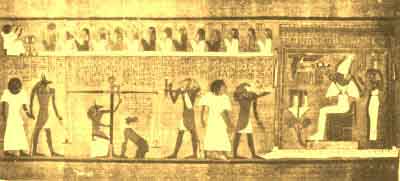 The judge is Osiris, behind whom stand Isis and Nepthys. Horus and Anubis lead in two forms of deceased. Thoth makes the record, another form of Anubis adjusts the balance, and the monster waits to destroy deceased if the verdict is unfavorable. On the upper part of the picture deceased salutes some of the two-and-forty gods who surround the Judgement Hall.