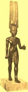 Amon-Ra was depicted as a great bearded man, clad in a sleeveless tunic suspended from his shoulders, with the tail of art animal hanging behind. His headdress of