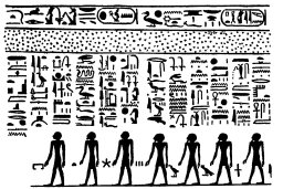 [paragraph continues] Tuat. This god is drawn by the gods of the Tuat (in order to make divisions (or, distinctions) in the earth, and to work out [his] designs therein, to weigh words and deeds in Ament, to magnify the great god above the little god among the gods. who are in the Tuat, to place the KHU (i.e., the blessed dead) upon, their thrones, and the damned [in the place] to which they have been condemned in the judgment, and to destroy their bodies by an evil death. Ra saith:--'O grant ye to me that I may restore the tiara, and that I may have possession of [my] shrine which is in the earth. Let SA and HEKA unite themselves to me for the working out of plans for you, and for making to come into being their attributes (or, forms) ye [have] (what is yours. Isis hath made to be at peace the wind, and offerings are there. None shutteth [the door] against you, and the damned do not enter in after you. That which belongeth to you is to you, O gods.' These gods say unto Ra, 'There is darkness on the road of the Tuat, therefore let the doors which are closed be unfolded, let the earth open, so that the gods may draw along him that hath created them.' Their food [i.e., the food of these gods] is of the funeral offerings, and their drink is from their cool waters, and their hands are on meat offerings among the Akert regions of Ament."
