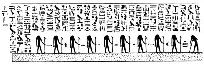 The first group shows us what "TEM hath done for Ra, and how he hath protected the god by words of magical power, and hath overthrown the serpent SEBA. [TEMU saith:--] 'Thou art prostrate, and thou shalt never more rise up; thou art enchanted by [my enchantments], and thou shalt never more be found. The word of my father is maat against thee, and my word is maat against thee; I have destroyed thee for Ra, and I have made an end of thee for KHUTI.'