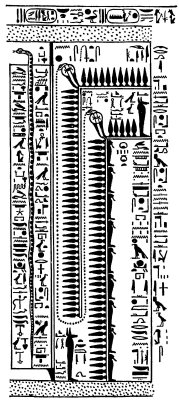 "Those who are in this scene carry this serpent. Ra striketh them and advanceth towards them to make himself to rest in [the gateway called] NEBT-AHAU. This serpent travelleth as far as it (i.e., this (gateway), but he passeth not beyond it. Ra saith unto them:--'Strike ye the serpent ENNUTCHI there, give him no way [whereby to escape], so that I may pass by you. Hide your arms, destroy that which