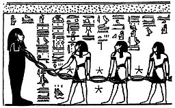 3. An upright, bearded mummied form called QAN. To the neck of this figure are attached two ropes, which are twisted together symmetrically, and are grasped by twelve bearded men with both hands. Each god stands within a loop formed by the two ropes, and has a star before him. The gods are described as "those who hold the rope which cometh forth . . . . . . . ."