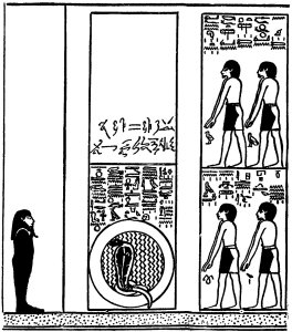 [paragraph continues] Part of the text of the speech which the nine gods make to Ra is broken away, but what remains reads, "Open the secret places, open the holy pylons, and unfold the hidden portals." The monster serpent which stands on his tail and guards the gateway is called AKHA-EN-MAAT, and the two lines of text which refer to his admission of Ra read, "He who is over this door openeth to Ra. SA saith to AKHA-EN-MAAT 1:--'Open thy gate to Ra, unfold thy doors to KHUTI, that he may send light into the thick darkness and may make his radiance illumine the hidden habitation! This door is shut after the great god hath passed through it, and there is lamentation to those who are in this gateway when they hear this door close upon them." A portion of the text is mutilated, but it can be restored with certainty. 2