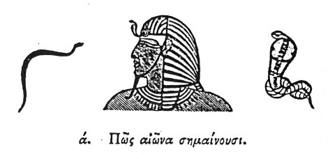 they delineate a SERPENT with its tail covered by the rest of its body: the Egyptians call this Ouraius, 1 which in the Greek language signifies Basilisk: 2 And they place golden figures of it round the Gods. The Egyptians say that Eternity is represented by this animal; because of the three existing species of serpents, the others are mortal, but this alone is immortal; and 3 because it destroys any other animal by merely breathing upon 4 it even without biting. And hence, inasmuch as it thus appears to have power over life and death, they place it upon the head of the Gods.