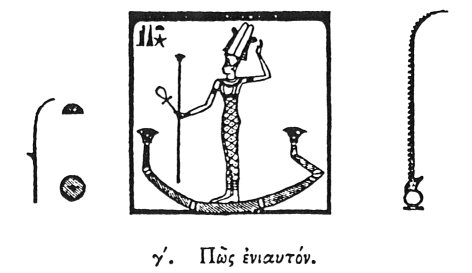 [paragraph continues] ISIS, i. e. a woman. By the same symbol they also represent the goddess. Now Isis is with them a star, called in Egyptian, Sothis, but in Greek Astrocyon, [the Dog' star]; which seems also to preside over the other stars, inasmuch as it sometimes rises greater, and at other times less; sometimes brighter, and at other times not so; and moreover, because according to the rising of this star we shew all the events of the ensuing year: 1 therefore not without reason do they call the year Isis. When they would represent the year otherwise, they delineate a PALM TREE 2 [BRANCH], because of all others this tree alone at each renovation of the