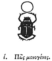 And they symbolise by this an only begotten, because the scarabæus is a creature self-produced, being unconceived by a female; for the propagation of it is unique after this manner:—when the male is desirous of procreating, he takes dung of an ox, and shapes it into a spherical form like the world; he then rolls it from the hinder parts from east to west, looking himself towards the east, that he may impart to it the figure of the world, (for that is borne from east to west, while the course of the stars is from west to east): then, having dug a hole, the scarabæus deposits this ball in the earth for the space of twenty-eight days, (for in so many days the moon passes through the twelve signs of the zodiac). By thus remaining under the moon, the race of scarabæi is endued with