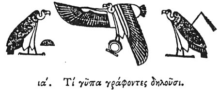 she partakes neither of food nor drink, being intent upon procreation. There are also other kinds of birds which conceive by the wind, but their eggs are of use only for food, and not for procreation; but the eggs of the vultures that are impregnated by the wind possess a vital principle. The vulture is used also as a symbol of vision, because it sees more keenly than all other creatures; and by looking towards the west when the sun is in the east, and towards the east when the god is in the west, it procures its necessary food from afar. And it signifies a boundary [landmark?] because, when a battle is to be fought, it points out the spot on which it will take place, by betaking itself thither seven days beforehand:—and foreknowledge, both from the circumstance last mentioned,