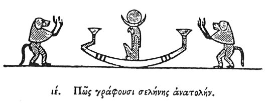When they would denote the renovation of the moon, they again pourtray a CYNOCEPHALUS in this posture, standing upright, and raising its hands to heaven, with a diadem upon its head; and for the renovation they depict this posture, into which the cynocephalus throws itself, as congratulating the goddess, if we may so express it, in that they have both recovered light.