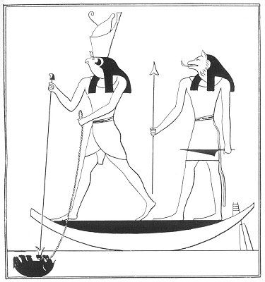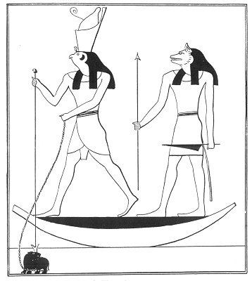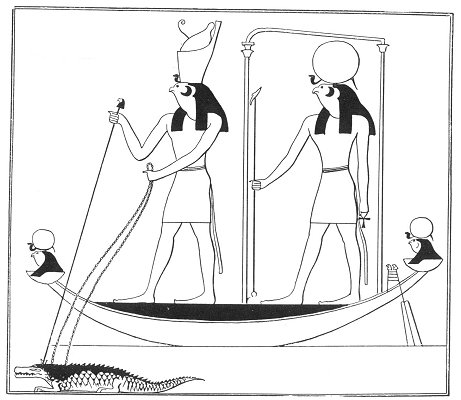 In gladness of heart Ra proposed a sail on the Nile, but as soon as his enemies heard that he was coming, they changed themselves into crocodiles and hippopotami,