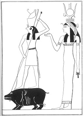 Horus standing on the back of the Hippopotamus-fiend, and spearing him in the presence of Isis.