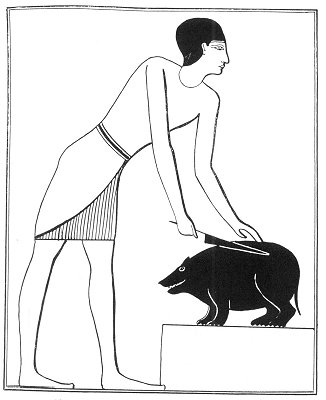 After this the enemy fled to the North, and took refuge in the swamps of the Delta, and in the shallows of the Mediterranean Sea, and Horus pursued them thither. After searching for them for four days and four nights he found them, and they were speedily slain. One hundred and forty-two of them. and a male hippopotamus were dragged on to the Boat of Ra, and there Horus dug out their entrails, and hacked their carcases in pieces, which he gave to his Blacksmiths and the gods who formed the crew of the Boat of Ra. Before despatching the hippopotamus, Horus leaped on to the back of the monster as a mark of his triumph, and to commemorate this event the priest of Heben, the town wherein these things happened, was called "He who standeth on the back ever after.