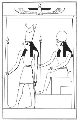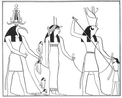 Right: Horus of Behutet, accompanied by Ra-Harmakhis and Menu, spearing the Hippopotamus-fiend.