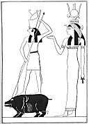 Horus driving his spear into the belly of the Hippopotamus-fiend as he lies on his back; behind stands on of his "Blacksmiths".
