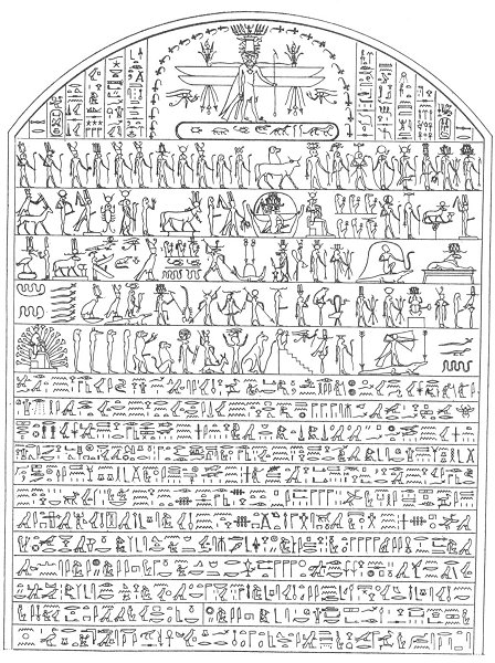 The obverse, reverse, and two sides of the Metternich Stele have cut upon them nearly three hundred figures of gods and celestial beings. These include figures of the great gods of heaven, earth, and the Other World, figures of the gods of the planets and the Dekans, figures of the gods of the days of the week, of the weeks, and months, and seasons of the year, and of the year. Besides these there are a number of figures of local forms of the gods which it is difficult to identify. On the rounded portion of the obverse the place of honour is held by the solar disk, in which is seen a figure of Khnemu with four ram's heads, which rests between a pair of arms, and is supported on a lake of celestial water; on each side of it are four of the spirits of the dawn, and on the right stands the symbol of the rising sun, Nefer-Temu, and on the left stands Thoth. Below this are five rows of small figures of gods. Below these is Harpokrates in relief, in the attitude already described. He stands on two crocodiles under a kind of canopy, the sides of which are supported by Thoth and Isis, and holds Typhonic animals and reptiles. Above the canopy are the two Eyes of Ra,