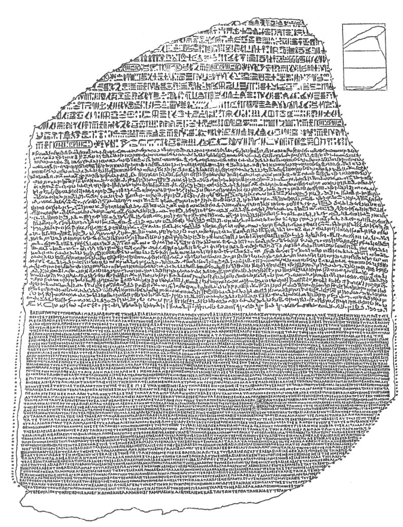 Contents of Rosetta Stone.The inscriptions on the Rosetta Stone form a version of a decree of the priesthood assembled at Memphis in honour of Ptolemy V., Epiphanes, King of Egypt, B.C. 195, written in hieroglyphics, demotic and Greek. A facsimile 1 of them was published by the Society of Antiquaries 2 in 1802, and copies were distributed among the scholars who were anxious to undertake the investigation of the texts. Principal works on the Rosetta Stone.The hieroglyphic text has been translated by Brugsch in his Inscriptio Rosettana, Berlin, 1851; by Chabas, L’Inscription hiéroglyphique de Rosette, Paris, 1867; and by Sharpe, The Rosetta Stone in hieroglyphics and Greek, London, 1871, etc. The Demotic text has been studied by M. de Sacy, Lettre à M. Chaptal sur l’inscription égypt. de Rosette, Paris, 1802; by Akerblad, Letter à M. de Sacy sur l’inscription égypt. de Rosette, Paris, 1802; by Young, Hieroglyphics (collected by the Egyptian Society, arranged by Dr. T. Young, 2 vols., fol., 100 plates, 1823-1828), pl. x ff.; by Brugsch, Die Inschrift von Rosette nach ihrem ägyptisch-demotischen Texte sprachlich und sachlich erklärt, Berlin, 1850; Salvolini, Analyse Grammaticale Raisonnée de