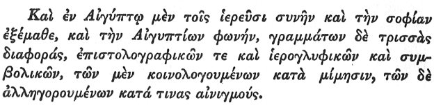Translation of the extract."Now, Homer says this as he was accurately instructed in all learning by means of the symbolic Ethiopian characters. For the Ethiopians do not use alphabetic characters, but depict animals of all sorts instead, and limbs and members of these animals; for the sacred scribes in former times desired