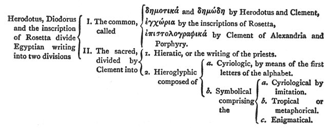 Pythagoras and hieroglyphics."And in Egypt he lived with the priests and learnt their wisdom and the speech of the Egyptians and three sorts of writing, epistolographic and hieroglyphic and symbolic, which sometimes speak in the common way by imitation and sometimes describe one thing by another in accordance with certain secret rules." Here it seems that Porphyry copied Clement inaccurately. Thus he omits all mention of the Egyptian writing called "hieratic," and of the subdivision of hieroglyphic called "cyriologic," and of the second sub- division of the symbolic called "tropic." The following table, based on Letronne, will make the views about hieroglyphic writing held by the Greeks plain:— Letronne's summary.