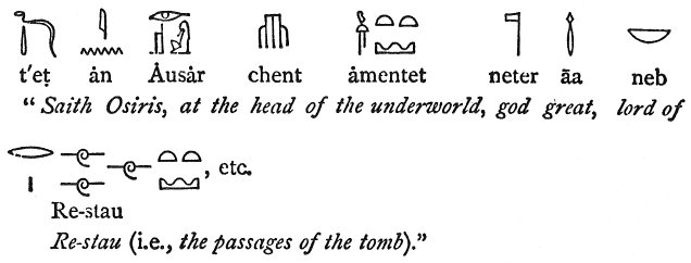 [paragraph continues] Aegyptiacus, t. III, p. 431, where he gives a translation of an inscription (A) printed on the plate between pp. 428 and 429. The hieroglyphics are written on a Ptaḥ-Seker-Osiris figure and read:—