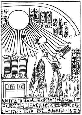 Amenhetep IV and his queen and family worshipping Aten.