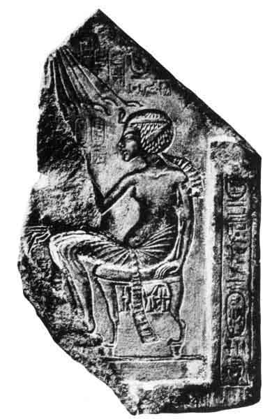 Amenhetep IV and his Queen Nefertiti and some of the daughters seated with the rays of Aten falling upon them. The queen wears the disk, horns and plumes of Hathor and Isis. The abnormal development of the lower part of the body seems to be a characteristic of every member of the royal family.