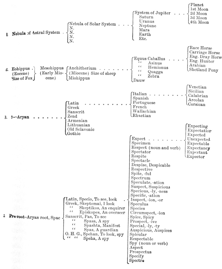 A short study of this tabular statement will make plain how orbs, species, languages and words branch, divide and multiply; will make intelligible Max Mueller's estimate that "every thought that has ever passed through the mind of India" may be reduced to one hundred and twenty-one root concepts—that is, to one hundred and twenty-one root words [116. 401]; will make us agree with him that, probably, that number might be still further reduced. If we consider for a moment that this means that the millions of Indo-European words now in use as well as many times the number long since dead and forgotten, nearly all sprang from about one hundred roots and that these in their turn probably from half a dozen, and at the same time remember that reason and speech are one, we shall obtain a glimpse of what the human intellect once was in comparison with what it is to-day; and likewise it becomes apparent at a glance that the evolution not only of species, languages and words is strictly parallel but that the scheme has probably a still wider, perhaps universal, application. As regards the present thesis the conclusion to be drawn from this comparison is that words, and that therefore the constituent elements of the intellect which they represent and which we call concepts, grow by division and branching, as new species branch off from older, and it seems clear that a normal growth is encouraged and an excessive and useless development checked by the same means in the one case as in the other—that is, by natural selection and the struggle for existence.