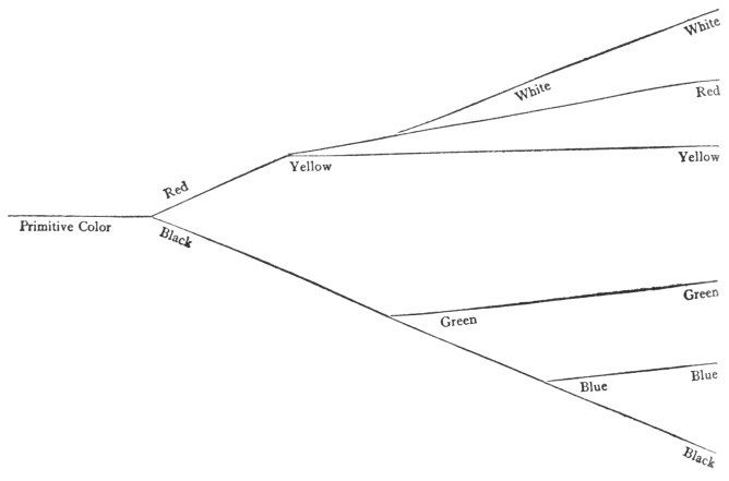 It does not seem possible that at the time when men recognized only two colors, which they called red and black, these appeared to them as red and black appear to us—though just what the sensations were which they so named cannot of course be now ascertained. Under the name red it seems they included with that color white, yellow and all intermediate tints; while under the name black they seem to have included all shades of blue and green. As the sensations red and black came into existence by the division of an original unital color sensation, so in process of time these divided. First red divided into red-yellow, then that red into red-white. Black divided into black-green, then black again into black-blue, and during the last twenty-five hundred years these six (or rather these four—red, yellow, green, blue) have split bp into the enormous number of shades of color which are now recognized and named. The annexed diagram shows at a glance the order in which the spectrum colors became visible to man.