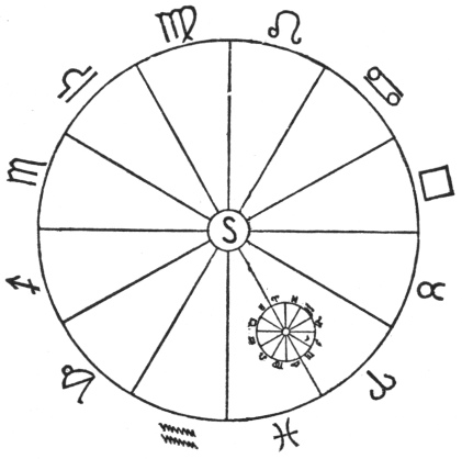 We find that around our earth there is also a zodiac, whose influence governs the physical body and its senses. This zodiac is separate from the zodiac of the sun and in its exact image, with the single exception that the order of the earth's zodiac is a reversal of the sun's zodiac. For illustration: When the earth is on that side of the sun represented by the sign Aries, and the moon is on a line with the sun and earth it is new in the sign Aries of the earth's zodiac, thus showing that, in relation to each other, the two zodiacs are in reversed order. Again, the earth being in the sign Aries, the moon is fullthat is, it is on a line with the sun and the earth, and on the side of the earth opposite to the