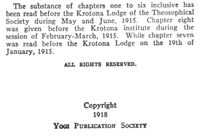 The substance of chapters one to six inclusive has been read before the Krotona Lodge of the Theosophical Society during May and June, 1915. Chapter eight was given before the Krotona institute during the session of February-March, 1915. While chapter seven was read before the Krotona Lodge on the 19th of January, 1915. |