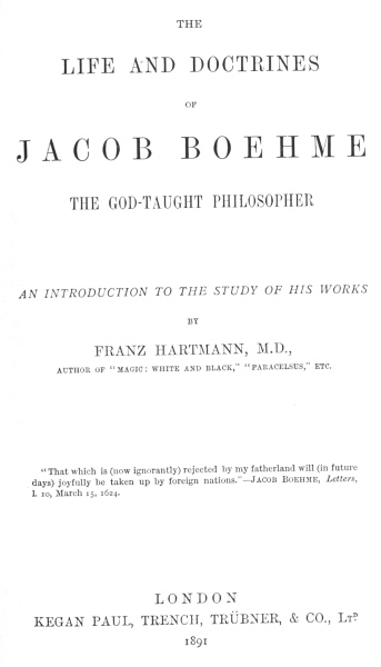 The Life and Doctrines of Jacob Boehme, by Franz Hartmann, [1891], at sacred-texts.com