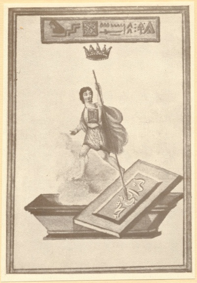 AT some distance from the shore a sumptuous palace raised aloft its alabaster columns; its different parts were joined by porticos of flame colour. The entire edifice was of light and airy architecture. As I approached the portals, I saw that the front was decorated with the figure of a butterfly. The doors stood open . . . I entered. The entire palace consisted of a single hall . . . surrounded by a triple colonnade, each rank composed of twenty-seven alabaster columns. In the middle of the building stood the figure of a man issuing from a tomb; his hand, holding up a lance, struck the stone which previously confined him. His loins were girt about with a green garment; gold gleamed from its hem. On his breast was a square tablet bearing several letters. Above this figure hung a golden crown and the figure seemed to lift itself into the air in order to seize the crown. Above it was a yellow stone tablet bearing several emblems which I explained by means of the inscription I saw on the tomb and by the one I had seen on the breast of the man.