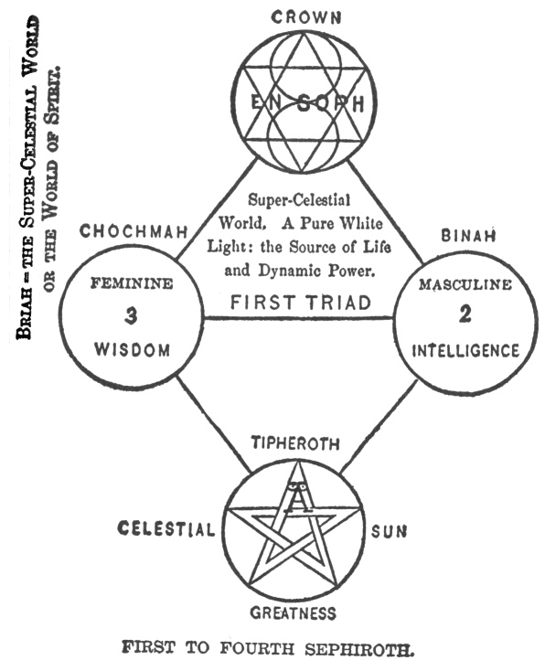 In the beginning was Or Haensoph, the eternal light, from whose brightness there descended a ray through the first-born of God, Adam Kadmon, and presently, departing from its straight course, ran in a circle, and so formed the first of the sephiroth, which was called Kethei, or the crown, because superior to all the rest. Having formed this circle, the ray resumed its straight course till it again ran in a circle to produce the second of the ten sephiroth, Chochma, wisdom, because wisdom is the source of all. The same ray of divine light passed on, losing gradually, as it became more distant from its holy source, some of its power, and formed presently, in like manner, the third of the sephiroth, called Binah, or understanding, because understanding is the channel through which wisdom flows to things below—the origin of human knowledge. The fourth of the sephiroth is called Gedolah or Chesed, greatness or goodness, because God, as being great and good,