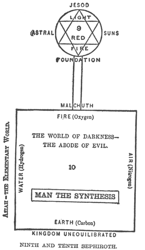 Little more has to be said about their theory, and that relates to the four Cabalistical Worlds. These were placed in the four spaces between the upper sephiroth. Between the first and second was placed Aziluth, the outflowing, which contained the purest beings, the producers of the rest. Between the second and third sephiroth was the world Briah, or the thrones, containing spirits less pure, but still not material. They were classed into wheels, lightnings, lions, burning spirits, angels, children of God, cherubim. Their prince was called Metatron. The world in the next interspace, called Jezireh, angels, approached more nearly to a material form; and the fourth, Asiah, was made wholly material. From this point density increases till our world is reached. Asiah is the abode of the Klippoth, or material spirits striving against God. They travel through the air, their bodies are of dense air, incorruptible, and they have power to work in the material world. With Catoriel, Adam Belial, Esau, Aganiel, Usiel, Ogiel, Thomiel, Theumiel, for captains, they fight in two armies under their chiefs Zamiel and Lilith. Their enemies are the angels, who contend against