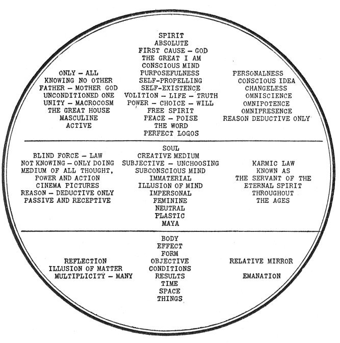 This chart, which is called the Universal Chart, shows the Universe as a Trinity of Being. The upper section designates those attributes of Spirit which are Self-Conscious. The middle section shows the subconscious aspect of Law; and the lowest section shows the effect of Spirit working through the medium of Universal Mind. Read and carefully study the full explanation and meaning of the words used in this chart.